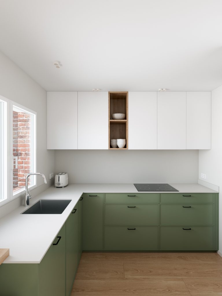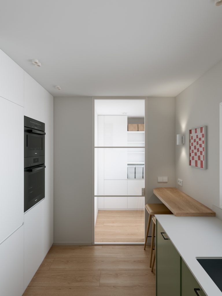 Se incorporó al salón parte de una terraza y se eliminó la zona de office en la cocina para sustituirla por muebles en columna. También se remodeló el tendedero y se diseñaron las puertas de entrada a salón y cocina, de forma que se comunicaran visualmente los espacios y se potenciara la entrada de luz de ambas fachadas. El estilo decorativo se planteó como algo actual pero a la vez atemporal.